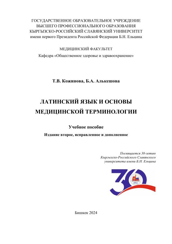 Creators Кожинова Т. В.; Алькешова Б. А. Imprint Бишкек: Издательский дом КРСУ, 2024 Collection Учебные издания преподавателей КРСУ Subjects Филологические науки — Индоевропейские языки — Мертвые языки — Латинский; Медицинские науки UDC 811.124+61(075.8) Document type Tutorial File type PDF Language Russian Rights чтениеИ, печатьИ, копированиеИ Record key RU/ГПНТБ России/KNIGI/81/К 58-124870922 pdf, 4.3 Mb -