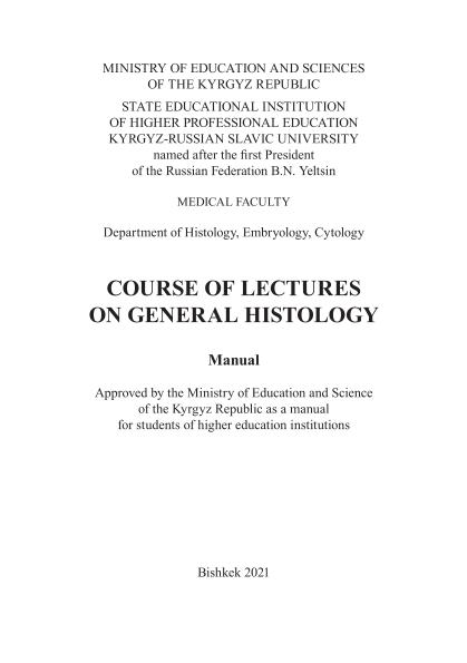 Creators Kalugina O. P.; Belina Yu. V.; Matekova N. A.; Turdubekova I. T. Other creators Kalugina O. P. Imprint Bishkek: Publishing House of KRSU, 2025 Collection Учебные издания преподавателей КРСУ Subjects Медицинские науки — Анатомия человека — Гистология UDC 611.018(075.8) Document type Tutorial File type PDF Language English Rights чтениеИ, печатьИ, копированиеИ Record key RU/ГПНТБ России/KNIGI/61/N79-501047756 pdf, 5.7 Mb -